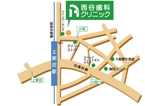 阪神高速12号守口線「城北」出口を出て、城北筋を北方面に進む。「菅原2」交差点を右折して、府道16号に入る。「大桐2」交差点を左折して、内環状線(国道479号)に入る。「小松1」交差点を右折して、1つ目の角を左折して進むと左角に「デイリーヤマザキ」が見えます。その角を折すると当クリニックが見えます。